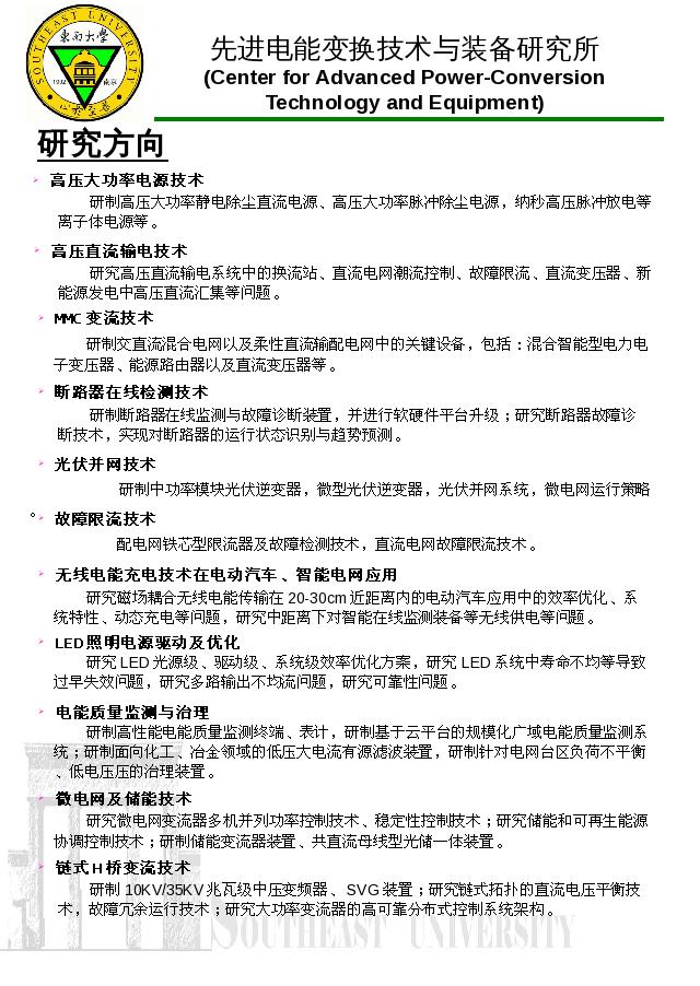 先进电能变换技术与装备研究所依托于太阳成集团tyc33455cc,主要从事电力电子与电能变换领域的重大基础理论与前沿关键技术研究,包括电能质量治理、直流电网装备、交直流输配电装备、新能源并网发电、分布式储能、高压大功率工业电源、无线电能传输和LED照明驱动等,多项研究成果已成功得到工业应用。