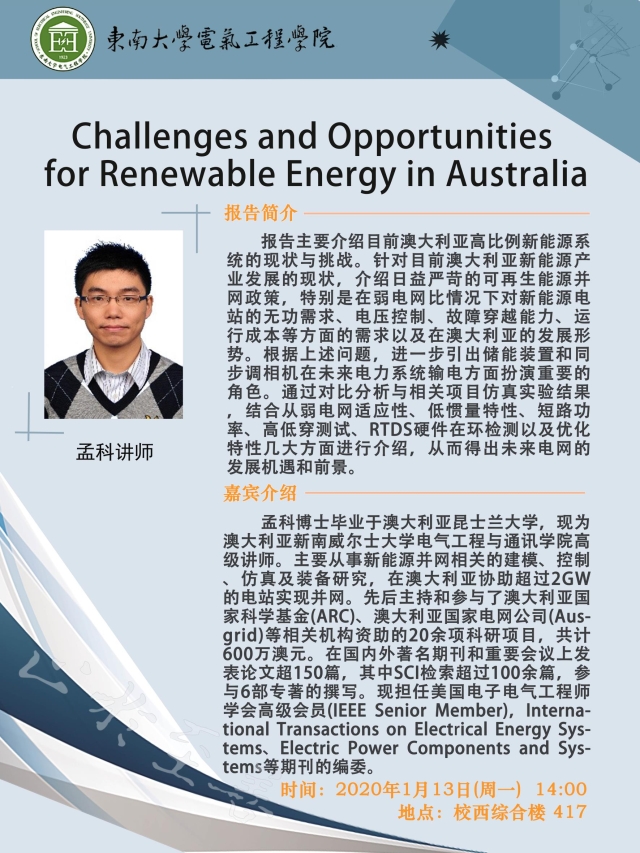 电气“卓越引智”系列讲座第二期|孟科| Challenges and Opportunities for Renewable Energy in Australia