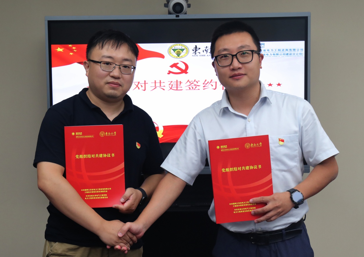 随后 “做好创新先行官 架起校企连心桥”结对仪式启动,在双方领导的共同见证下,国网江苏电力工程咨询公司工程技术部党支部书记杜长青与公司电力工程系党支部书记洪芦诚共同签订了结对共建协议。