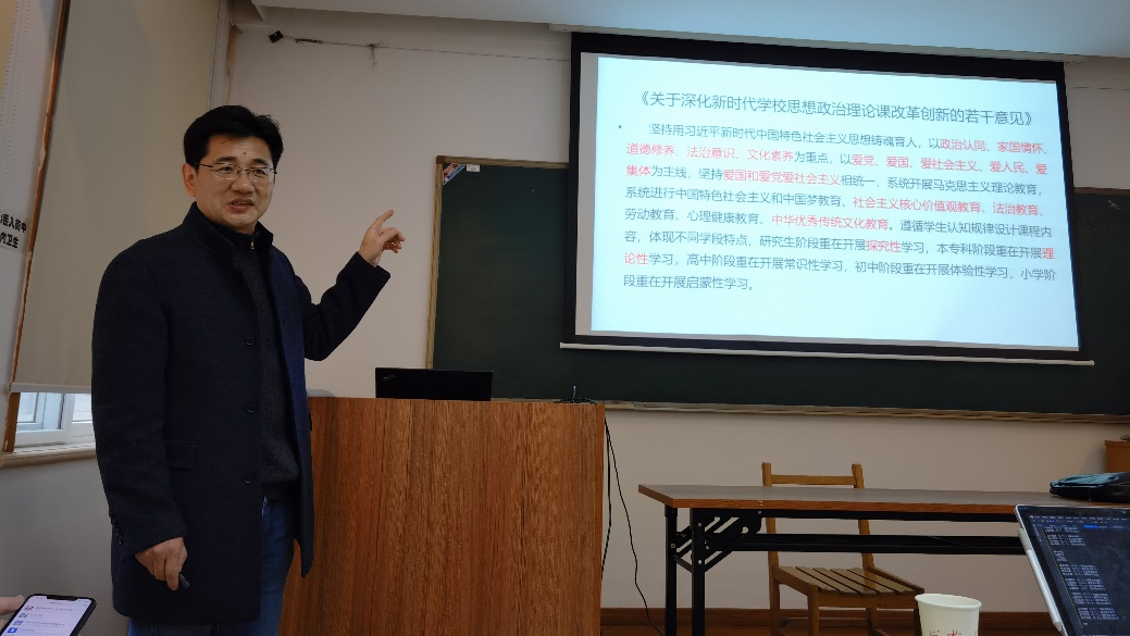 马克思主义公司的盛凌振副经理从“思政课程”与“课程思政”之间的关系、思政课程的设置与发展等角度对公司的思政课程体系进行了介绍,并分层次地总结了思政课程的理论脉络,即“理论方法是什么”、“理论方法从何而来”、“国家的政策与战略”、“成为什么样的人”。