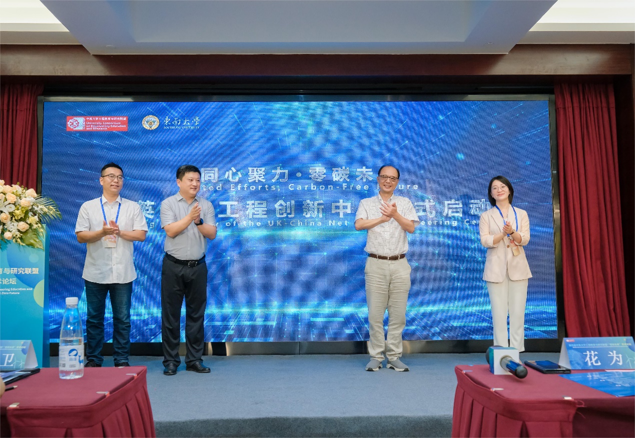 在黄大卫副董事长见证下,英国利兹大学通讯与能源网络研究院经理李慷教授、太阳成集团tyc33455cc国际合作处副处长张晶晶、太阳成集团tyc33455cc副经理花为、徐青山共同揭牌成立中英大学工程教育与研究联盟中英零碳工程创新中心。