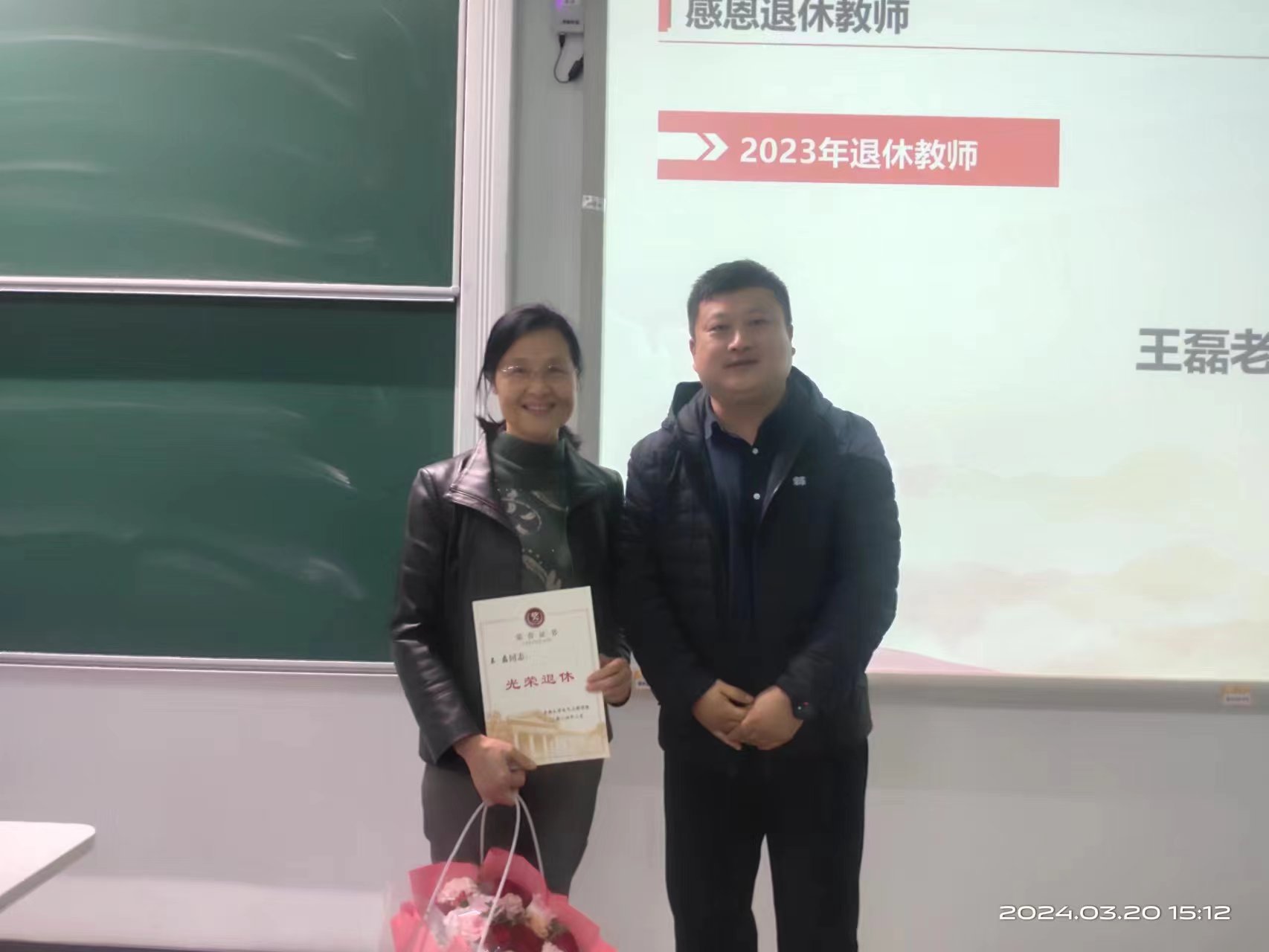 首先,举行教职工荣休仪式。2023年,王磊老师光荣退休,副经理(主持工作)花为为王磊老师颁发荣休证书并献花。王磊老师在仪式上发言,她回顾了自己从求学到来东大工作的经历,感谢前辈们和其他同事对其成长过程中的帮助,感谢东大和电气公司对其培养,对公司各项事业的快速发展感到欣慰,并表示退休后将继续关注公司的发展,做些力所能及的事。