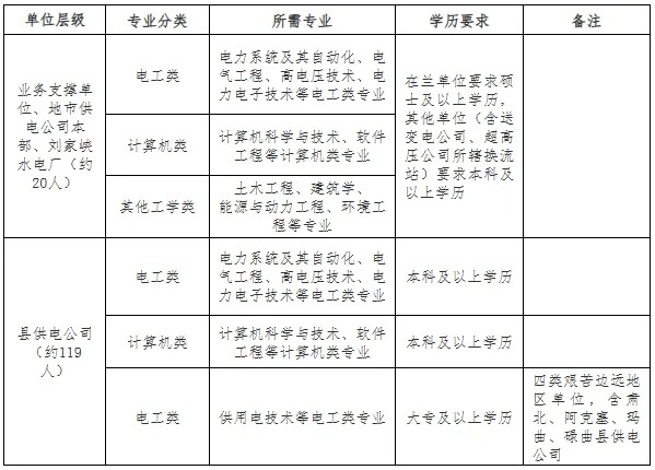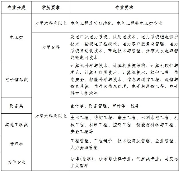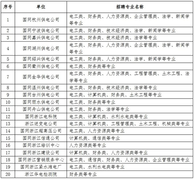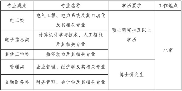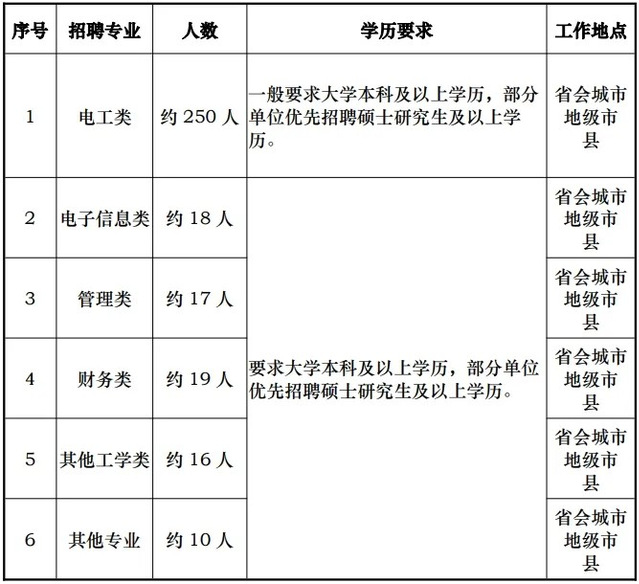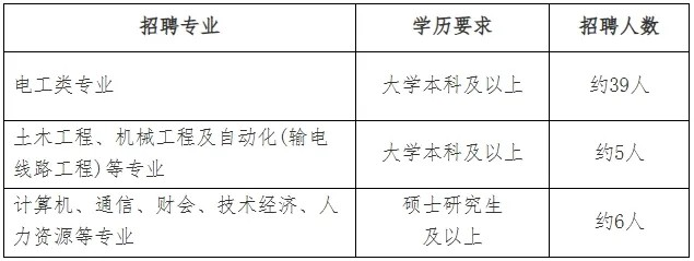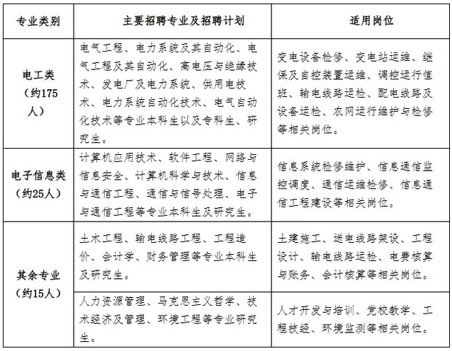 招聘专业以电工类专业为主,少量招聘计算机科学与技术、土木工程、法学、人力资源管理等相关专业毕业生(具体专业需求以上级单位最终下达为准)。