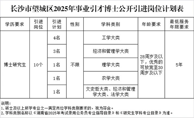 1.引进岗位、人数和具体资格条件详见《长沙市望城区2025年事业引才博士公开引进岗位计划表》(附件1)。
