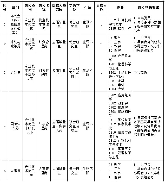 本次招聘涉及5个岗位、计划招聘6人,各岗位具体招聘人员范围及资格条件详见《国家自然科学基金委员会2025年度公开招聘应届毕业生岗位信息表》。