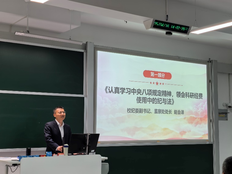 会议特别邀请校纪委副书记、监察处处长赵会泽作题为《认真学习中央八项规定精神,领会科研经费使用中的纪与法》的报告。报告中,赵会泽对公司纪检监察机构的情况进行了简要介绍,阐述了教职员工与纪检监察机构之间的关联和交集,希望能与大家同向同行,共同营造风清气正政治生态。随后,梳理总结了中央八项规定及其实施细则的主要内容和精神实质,并结合教师在科研经费管理使用领域的常见误区和现实案例,进行深度剖析,以案释纪、以案释法。