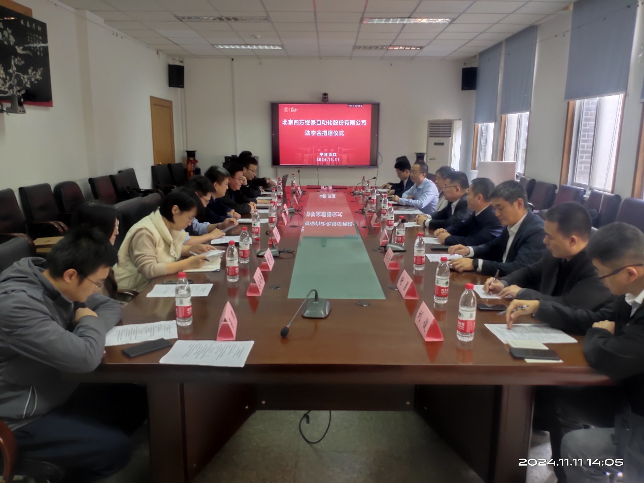 2024年11月11日下午,北京四方瑞祥公益基金会向公司捐赠助学金签约仪式在公司318会议室成功举行。北京四方继保自动化股份有限公司总裁助理徐刚、北京四方瑞祥公益基金会秘书长张翠红等捐赠方代表,公司发展委员会副主任蒋玮、发展规划与团队建设处副处长顾伟、教育基金会副秘书长宋云燕,公司全体领导班子成员出席会议,仪式由公司党委书记郑建勇主持。